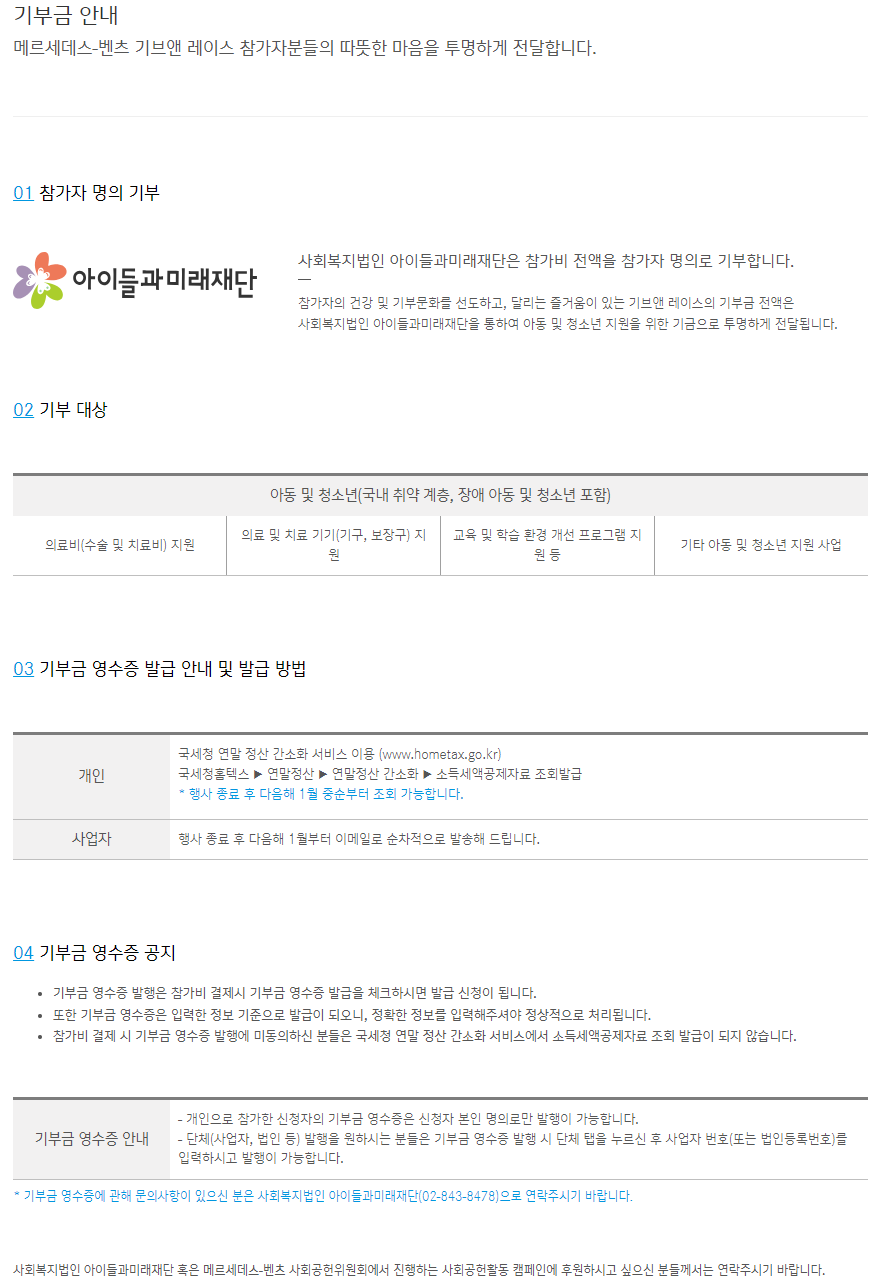참가자의 건강과 기부문화를 선도하고 달리는 즐거움이 있는 기브앤 레이스의 참가비 전액은 사회복지법인 아이들과미래재단을 통하여 아동 및 청소년 지원을 위한 기금으로 투명하게 기부됩니다.