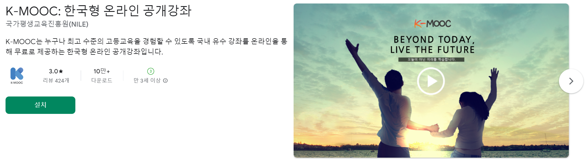 "K-MOOC 앱 학생, 직장인, 전문가 등 다양한 분들이 무료로 공부를 할 수 있는 대한민국의 온라인 교육 플랫폼입니다. 많은 개인들이 가치 있는 정보를 얻기 위한 스터디그룹도 있다고 합니다. 국내 명문 대학의 유익한 강의를 한눈에 확인하고 싶다면, 지금 바로 K-MOC 앱을 다운로드 받아 작성해보세요!"