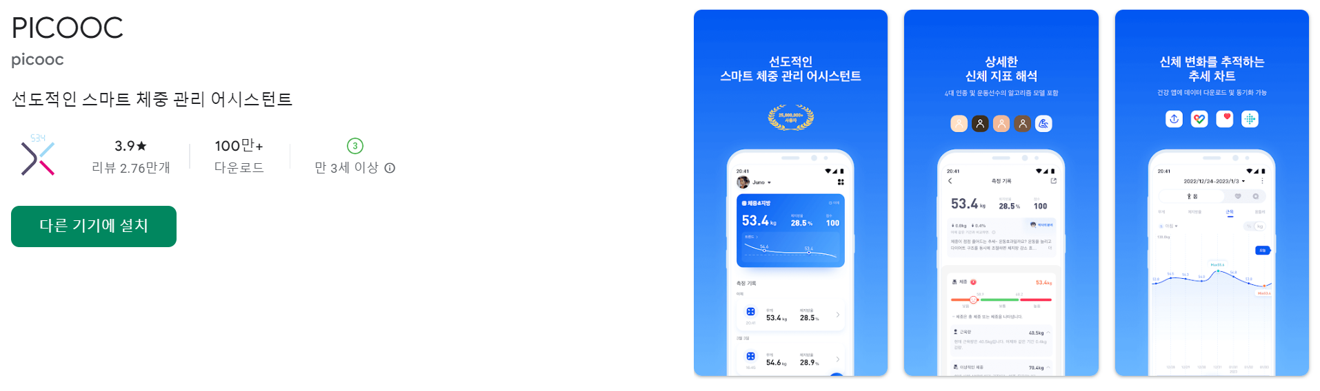 PICOOC 앱은 개인이 체중, 체성분 및 전반적인 피트니스 목표를 추적하고 관리할 수 있도록 설계된 건강 및 피트니스 애플리케이션입니다. PICOOC은 스마트 체중계 및 관련 기술을 전문으로 하는 회사로 스마트 체중계의 동반자 역할을 하는 앱입니다.