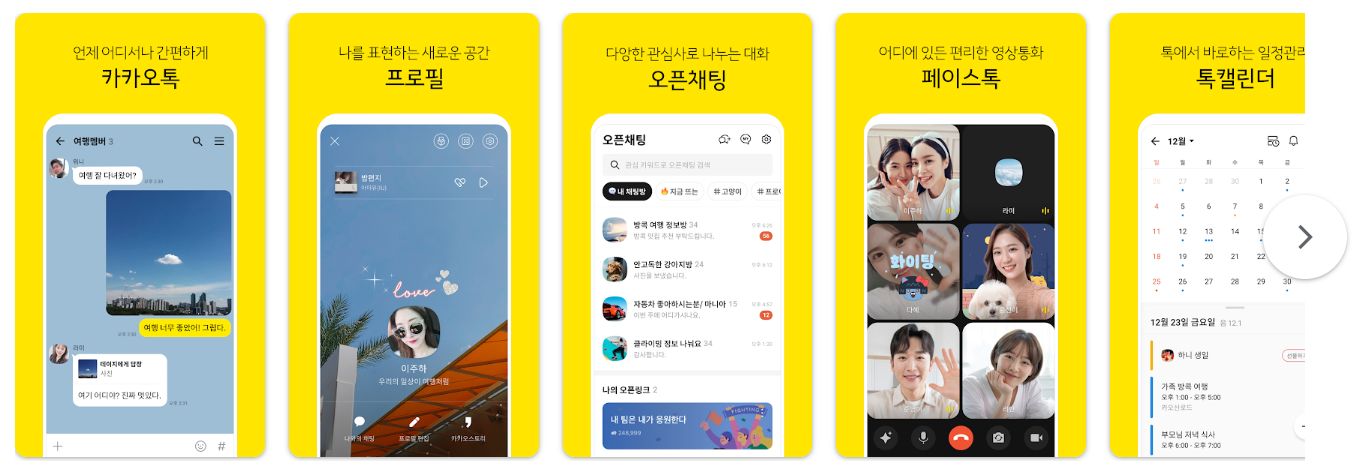 메시지: 사용자는 문자 메시지, 이모티콘, 스티커를 주고받아 연락처와 소통할 수 있습니다. 카카오톡은 여러 사용자가 하나의 대화에 참여할 수 있는 그룹 채팅도 지원합니다.
