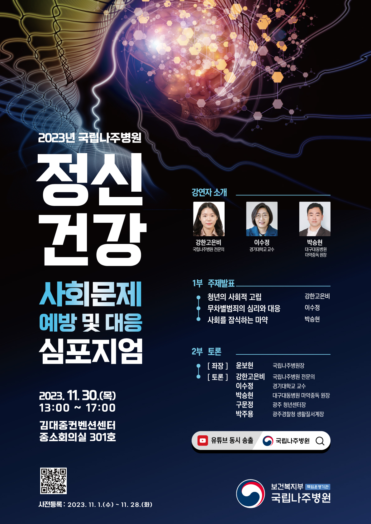 - 주제 발표자 3인과 구문정 광주 청년센터장, 박주용 광주경찰청 생활질서계장이 참석해 정신건강 사회문제의 예방책과 해결 방안에 대한 토론을 진행한다.
